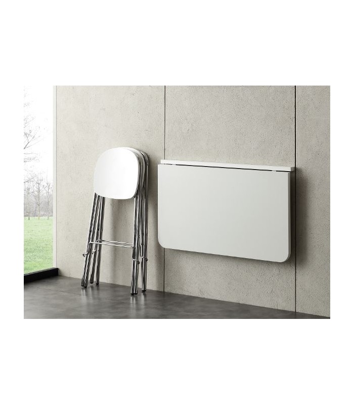Tavolo richiudibile mod. "Sesamo" da appendere a parete nella finitura laminato bianco con struttura in alluminio. Tavolo salvaspazio molto pratico. Comodo anche per chi vuole avere a disposizione solo un piano di lavoro in più.